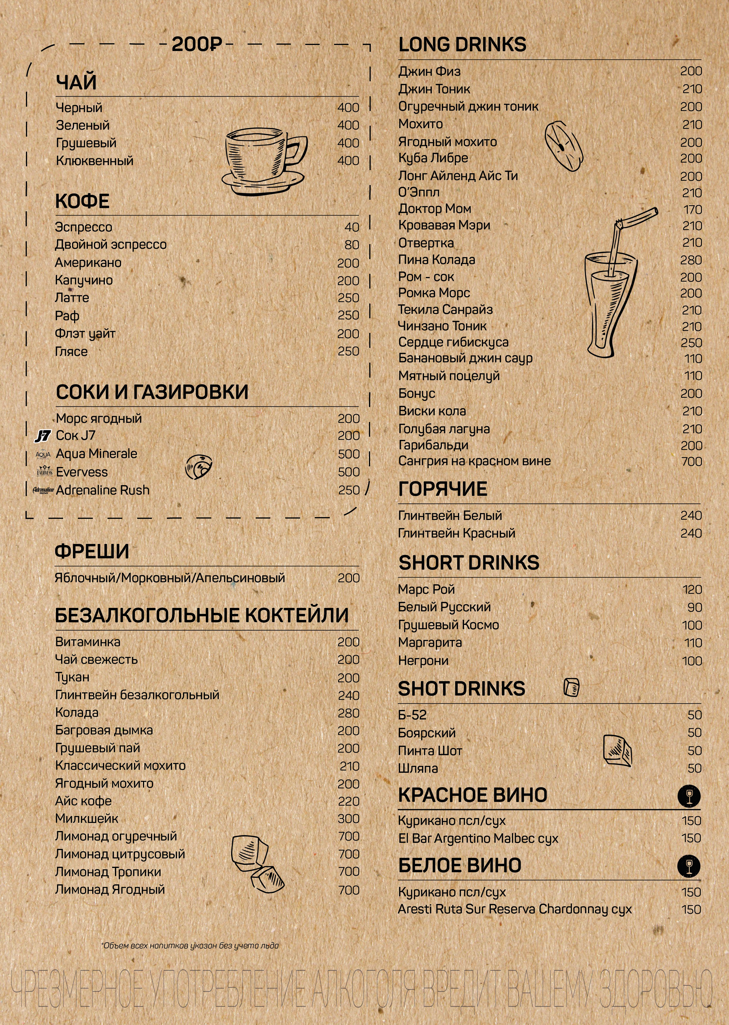 Новый большой паб в современном русском стиле. Зал на 200 мест, большая сцена и танцпол. Сюда можно зайти на бизнес-ланч или изысканный ужин в уютной атмосфере, а в пятницу и субботу - на вечеринку или концерт. Специальное русское меню дополнит уже полюбившиеся хиты Пинты.